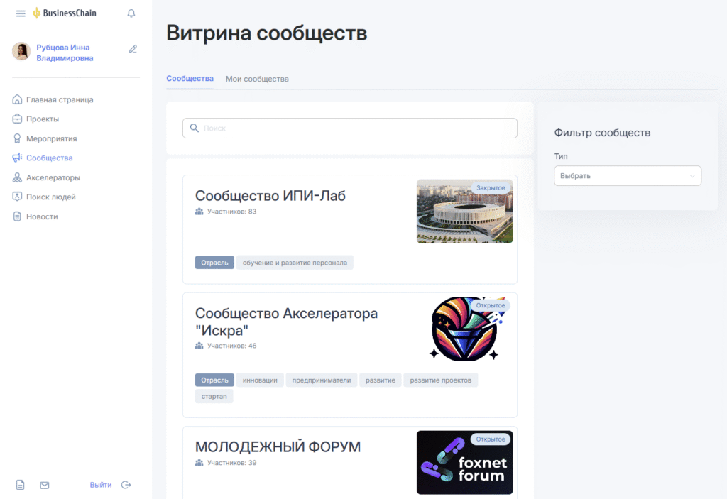 Витрина сообществ предназначена для поиска и просмотра профессиональных сообществ на платформе.