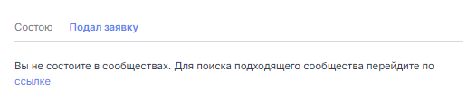 Если пользователь ещё не состоит ни в одном сообществе, отображается информационное сообщение с предложением выбрать подходящее сообщество во вкладке «Сообщества».